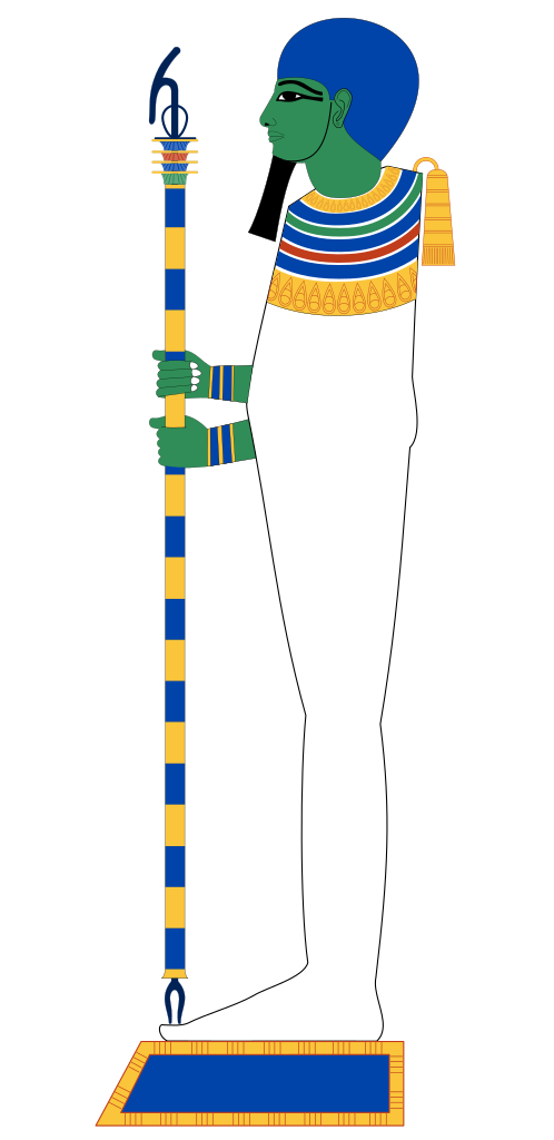 Ptah, the Pillar, standing on the symbol for Ma’at, holding a scepter or staff that bears the combined ankh-djed-was symbols. (Source: Jeff Dahl, CC BY-SA 4.0)