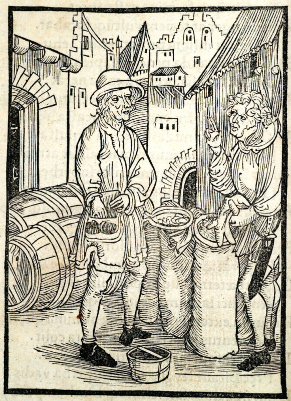 On usury and profiteering, Stultifera Navis (Ship of Fools), Sebastian Brant, Basel (1498 AD). Woodcut attributed to Albrecht Durer.