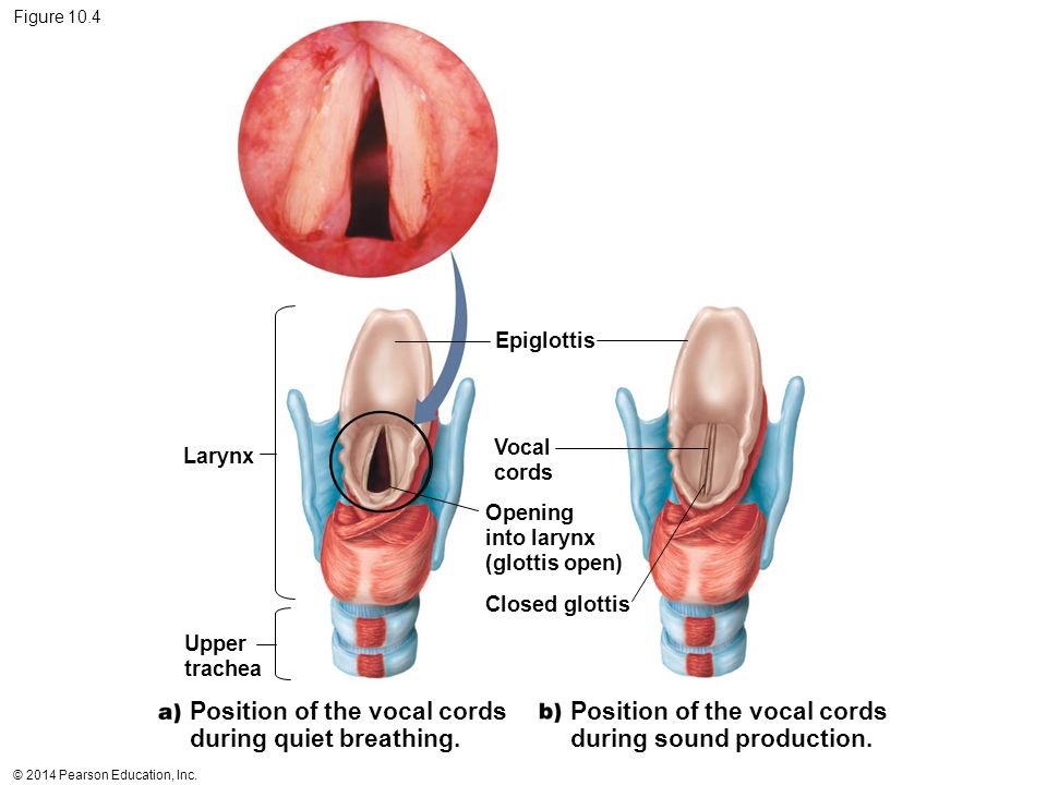 Figure Epiglottis. Vocal. cords. Larynx. Figure 10.4 Structures associated with the production of sound. Opening. into larynx. (glottis open) Closed glottis. Upper. trachea. Position of the vocal cords. during quiet breathing. Position of the vocal cords. during sound production.