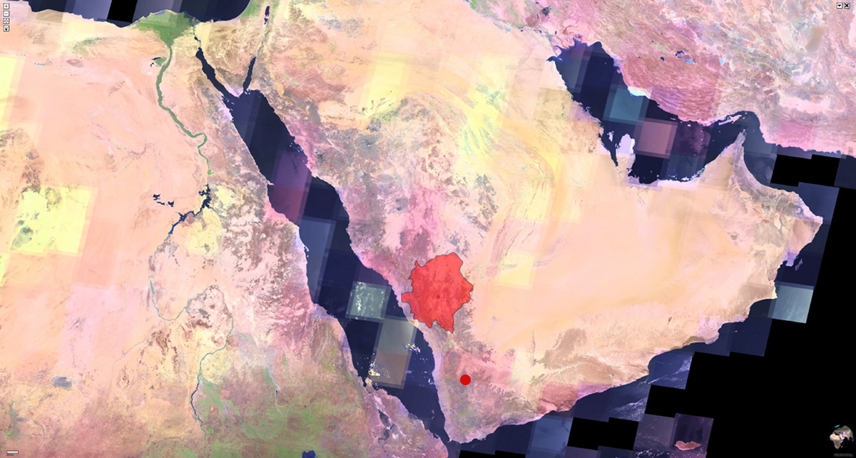 ‘Asir Region, Saudi Arabia (red). Sana’a, Yemen (red dot)