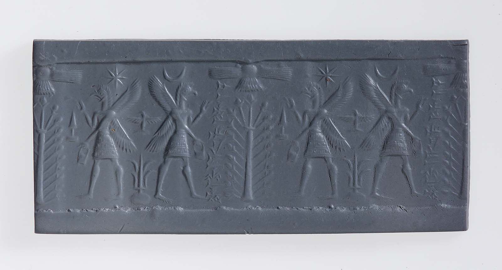 Neo-Assyrian, Early modeled Style (883–612 B.C.); Accession No. 65.1422 – Two bird-headed beings (“apkallu’s”/antediluvian sages) holding cone (mulillu/purifier) and bucket (banduddu) flank and fertilize “sacred tree” surmounted by winged sun-disk (Assur disk). Inscription to left of tree, spade symbol of Marduk (the marru) to right of tree, bird and plant in field. Star above bird-headed being at right, crescent above the one at left. (Source: MFA Boston)