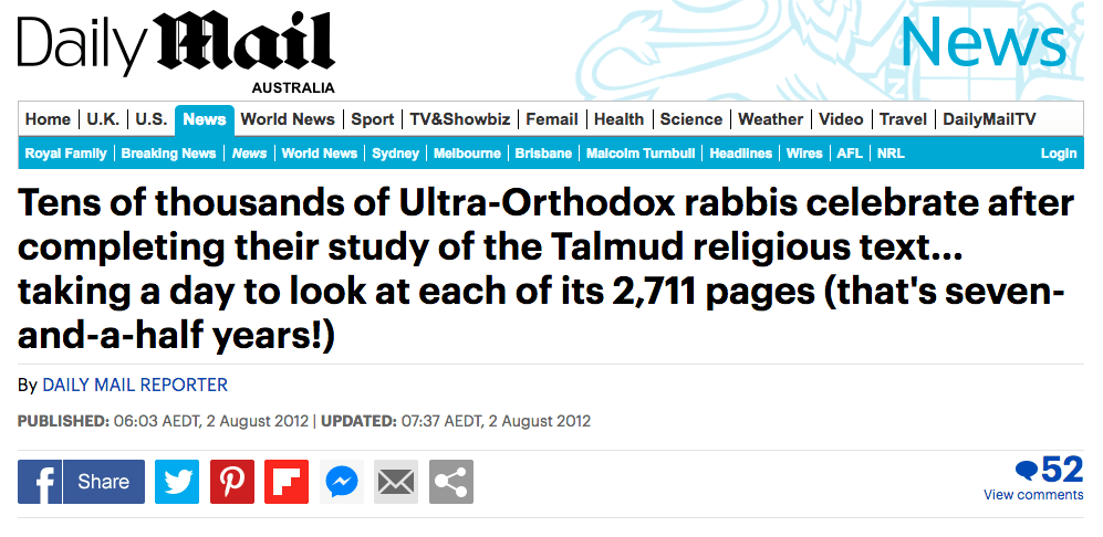Daily Mail UK, 2 August 2012 – “Tens of thousands of Ultra-Orthodox rabbis celebrate after completing their study of the Talmud religious text”