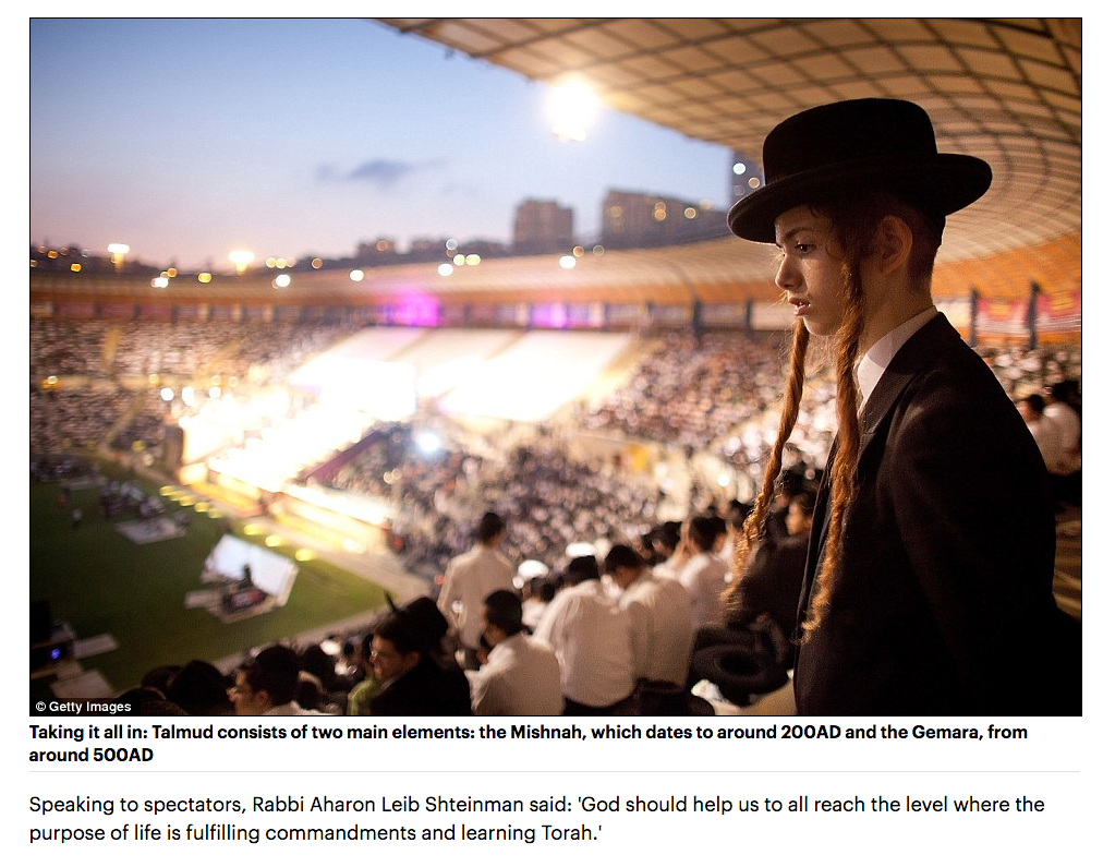 Daily Mail UK, 2 August 2012 – “Tens of thousands of Ultra-Orthodox rabbis celebrate after completing their study of the Talmud religious text”