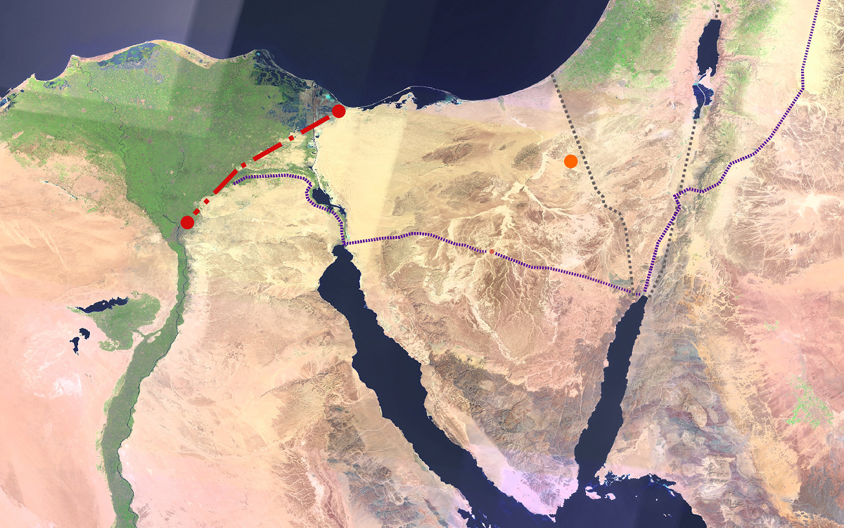 “Shur” (fortified wall), from Pelusium (NE) to Heliopolis (SW), Eastern delta (red). The King’s Highway trade route, (purple). Kadesh (Qadesh)-barnea (orange dot). “Way of Shur”: horizontal strip of green land from The Wall to start of King’s Highway.