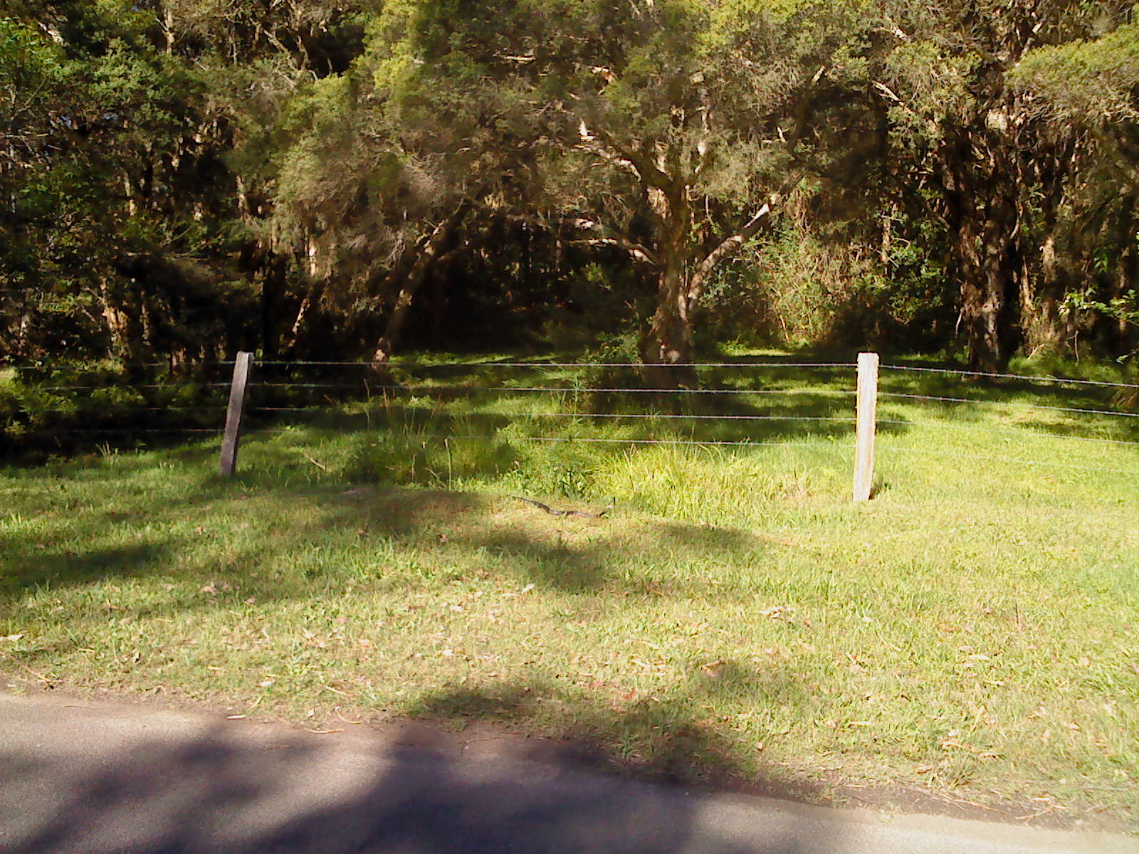 Barely 500 metres further, however, I was startled to suddenly spot a large red-bellied black snake in the grass no more than 5 metres ahead of me. I moved off the grass verge and onto the road, keeping my distance, and observed it for a short while.